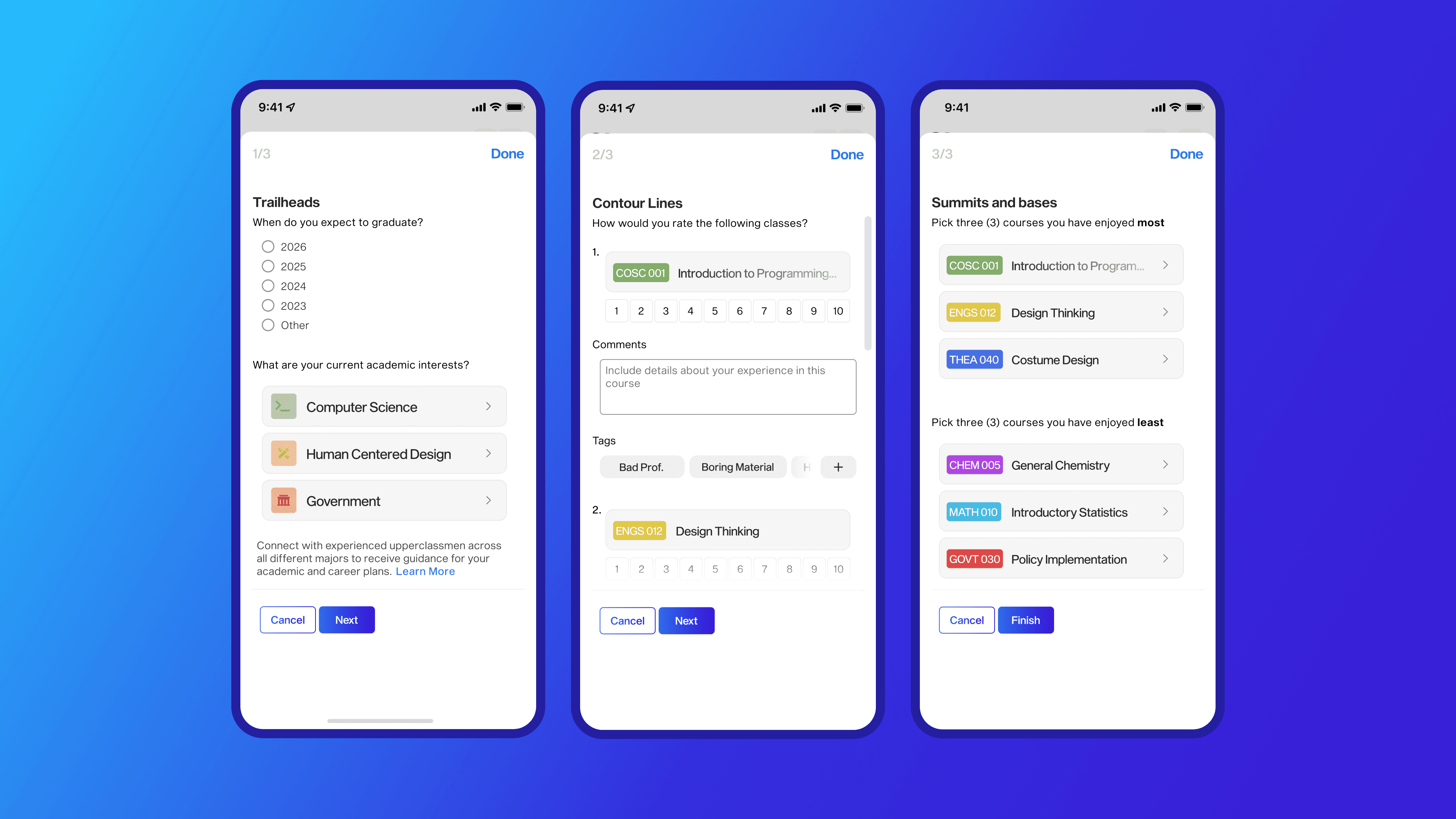 Trailheads collects data on students' favorite and least favorite courses to match underclassmen with mentors through 1 on 1 chats.
