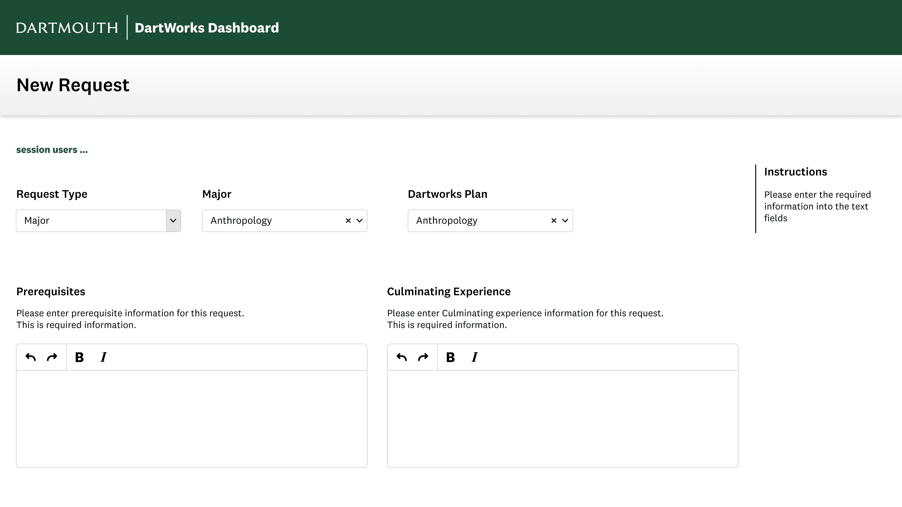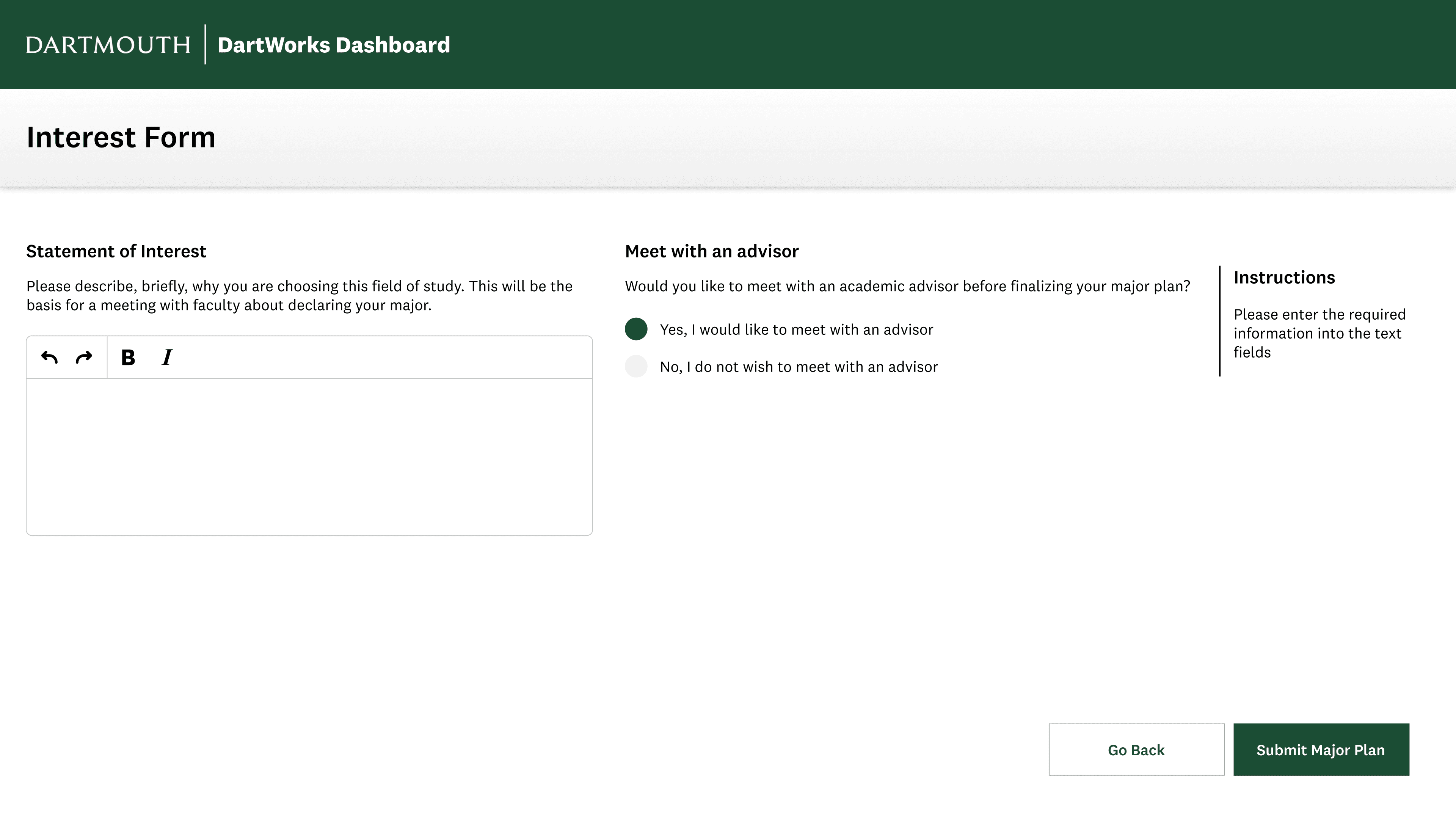 The obvious next step was to audit Dartmouth's major selection software for potential points of improvement. Having experience with the tedious process of declaring a major, I went through the college's software searching for insights. The major declaration flow included standard instructions such as adding courses and justifying courses included in major curricula. However, I wondered if it would be possible to include a step that invoked personal reflection before a major was declared, as a way to confirm genuine student follow-through.