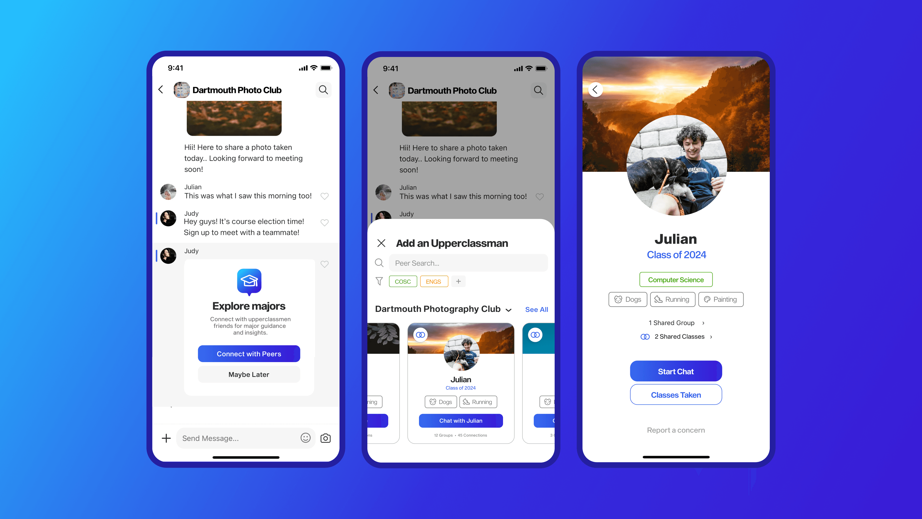 Initial ideas and prototypes suggested a few different directions. We first considered an experience-based design, like a major fair. However, when considering student reach and temporal constraints, we instead opted for a solution integrated within current Dartmouth technological infrastructure.